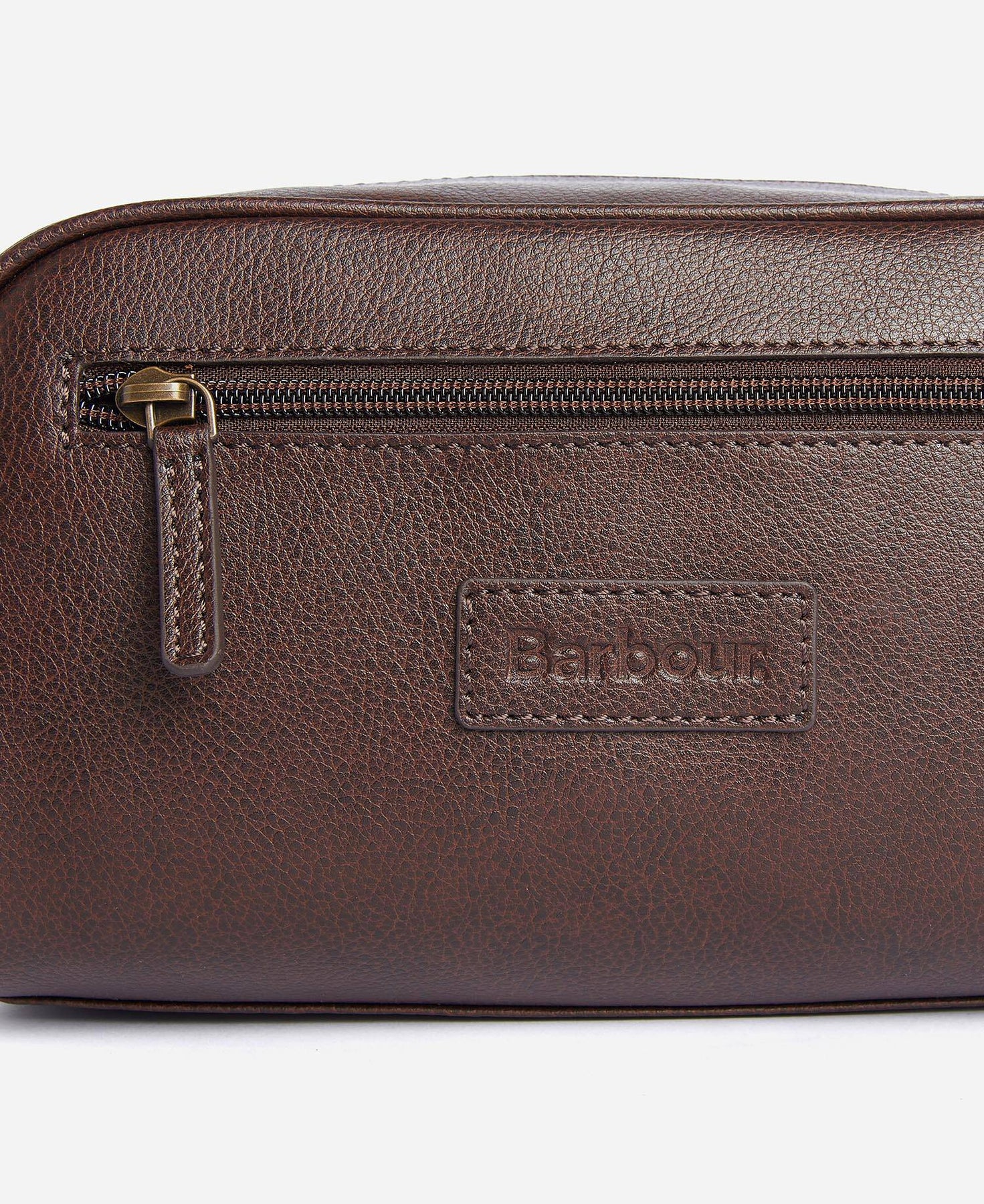 The Barbour Leather Washbag boasts rugged texture and charm thanks to its natural grained finish and rounded edges. A grab handle and external zipped pocket serve as practical additions, while an embossed logo badge to the front offers premium attention to detail.