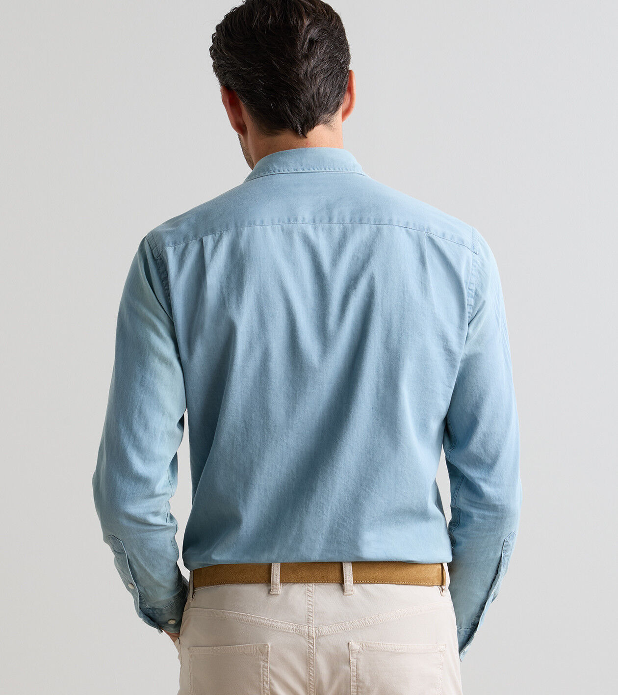 This shirt is made from a lightweight, especially soft washed indigo cotton fabric with a lived-in look and feel. Easily dressed up or worn casually, it's finished with a cutaway collar, French placket, mitered cuffs and mother-of-pearl buttons.