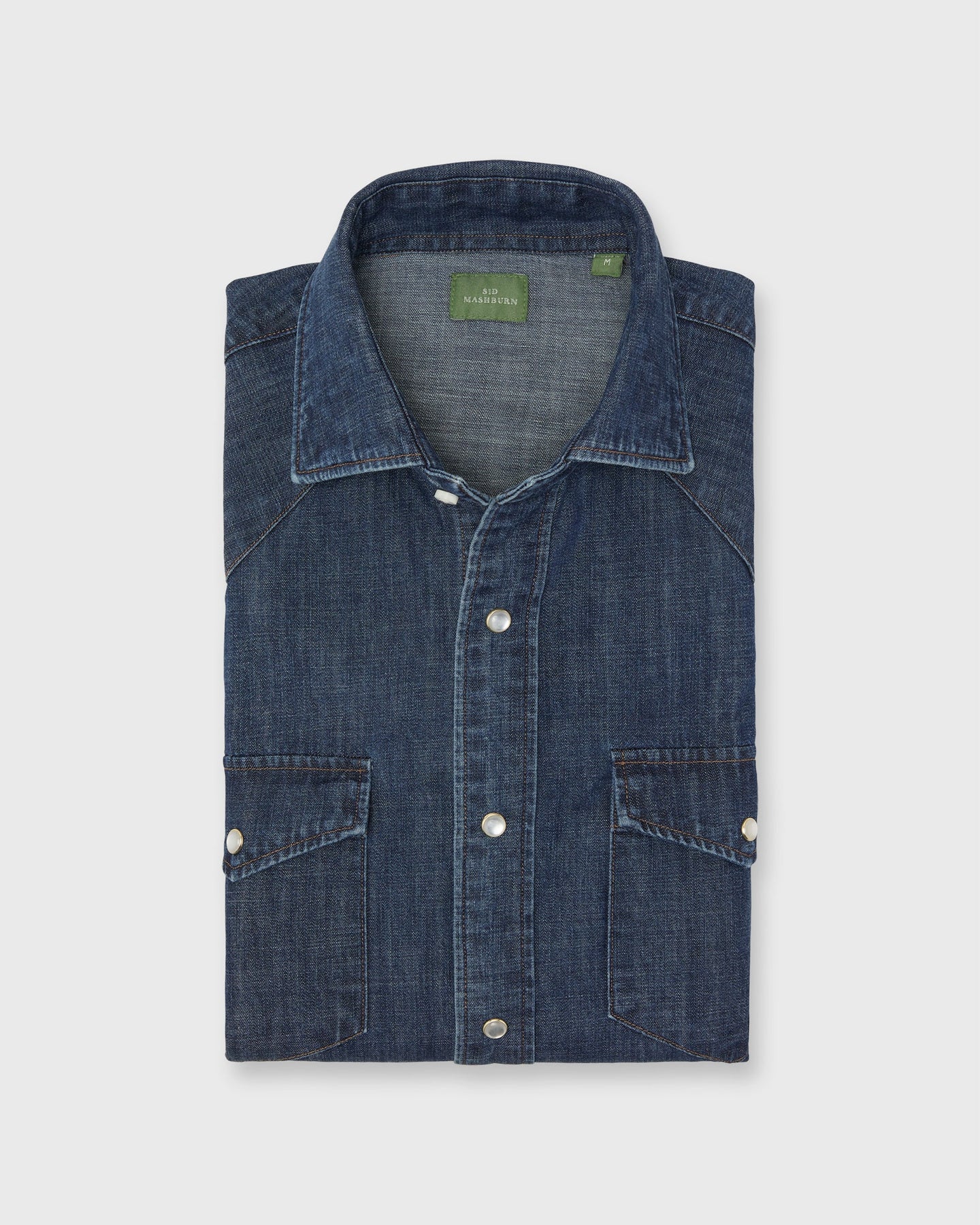 This is a true-blue Western shape down to the pearl snaps, pointed yoke, and triple-snap cuff, and we've updated it with a shorter length designed to wear untucked. There are two pointed snap pockets at the front, a modified spread collar, and an easy, slim-but-not-skinny shape. (Plus the same single-needle stitching, 22 stitches/inch, and flat-felled seams of all of our shirts.) It's made of a lightweight, washed indigo denim with visible highs and lows at the seams... it feels just right with the ruggedness of the Western silhouette.
