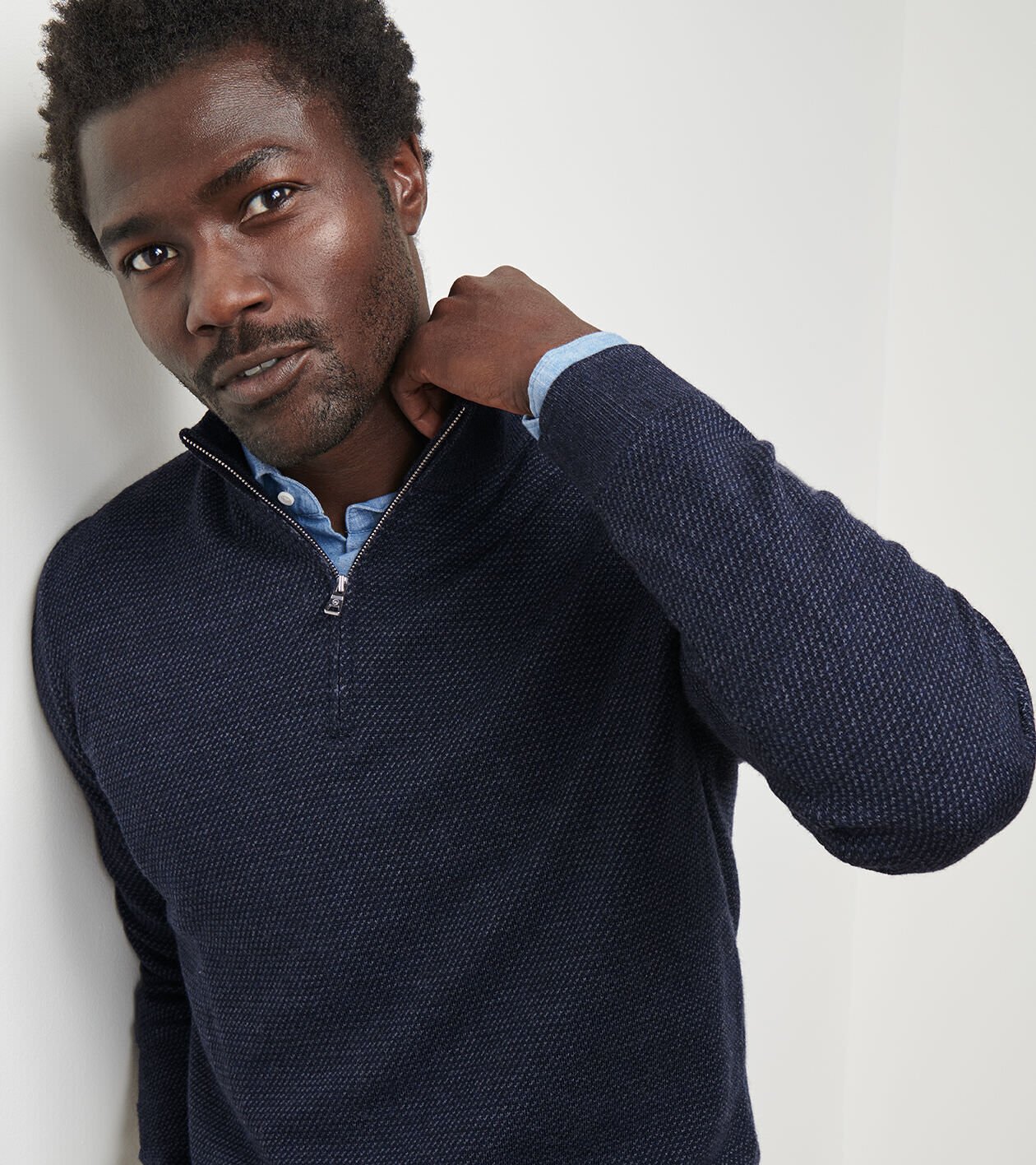 A new take on the classic midweight quarter-zip, this sweater features a diagonal jacquard pattern for subtle texture and a unique aesthetic. Especially soft and easy to pair, it's finished with a rib knit collar, cuffs and hem.