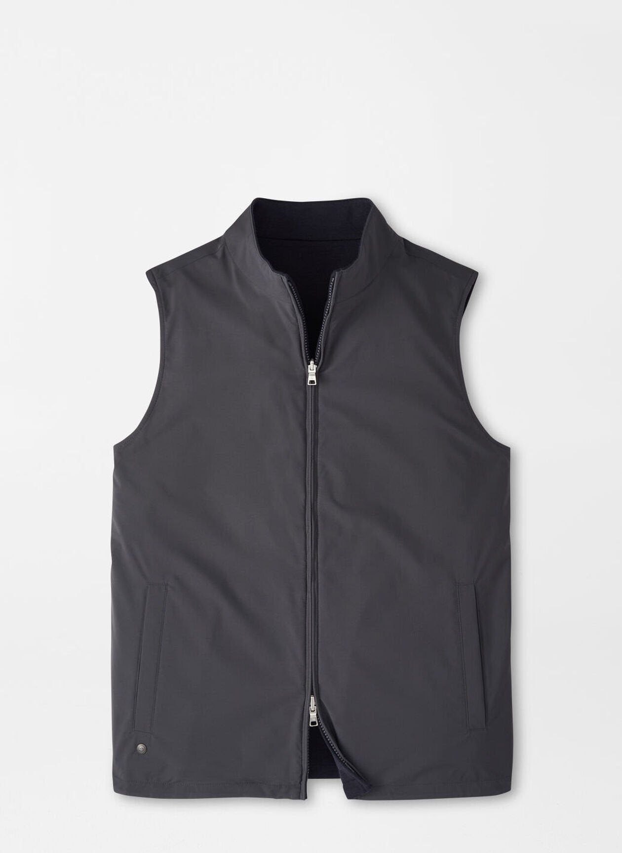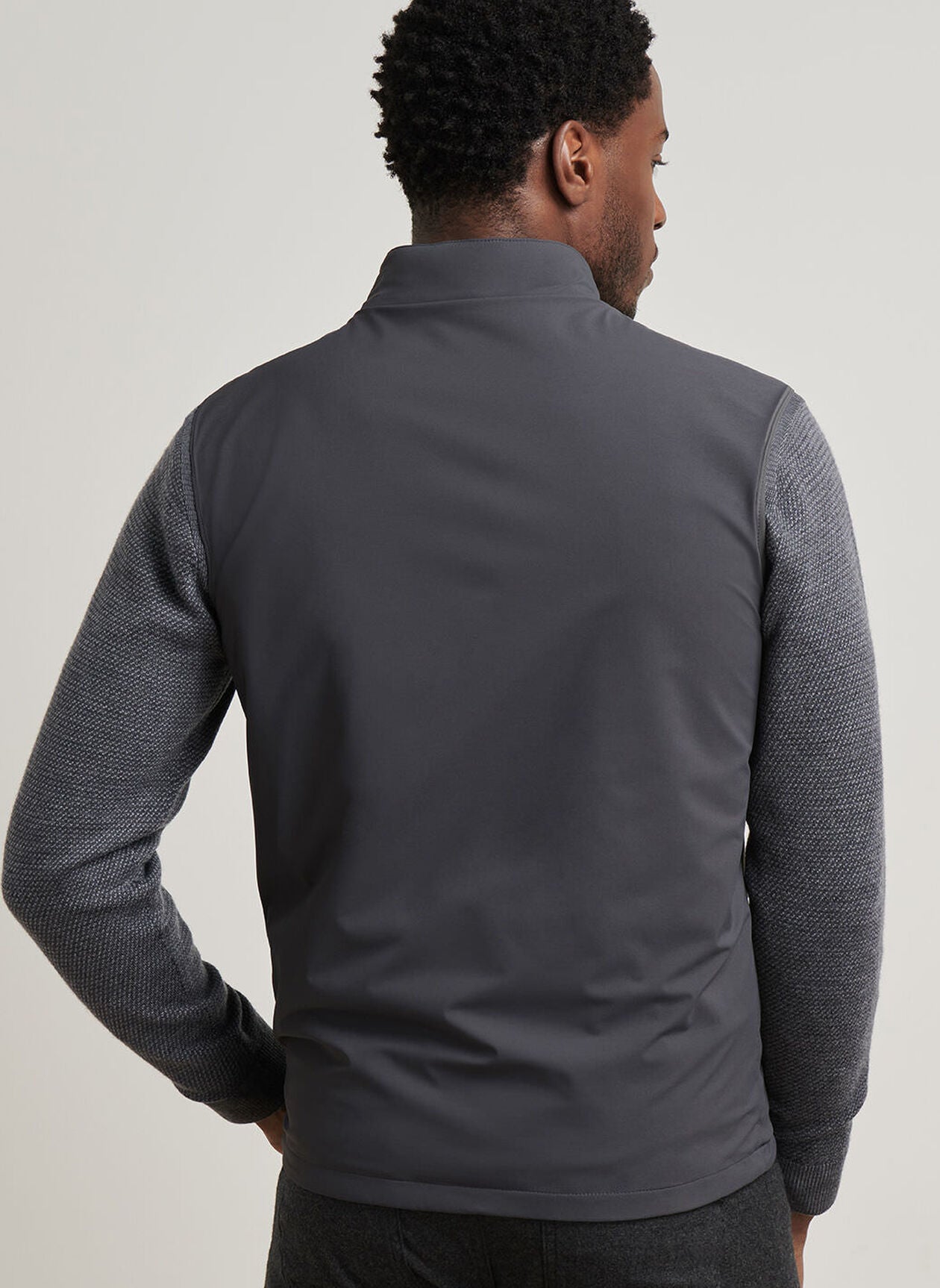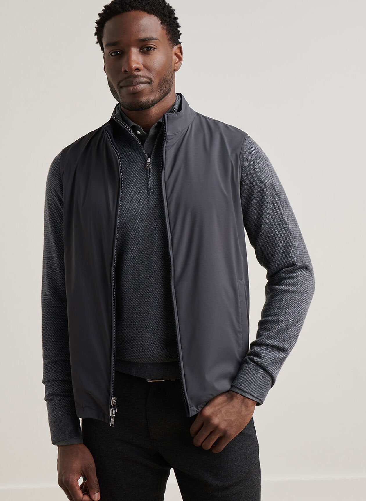 Perfectly capturing the spirit of Crown Crafted, this new vest offers sophisticated style and uncompromising function. With water-resistant, windproof stretch microfiber on one side and ponte-knit Merino on the reverse, it's primed for transitional weather, no matter the setting.