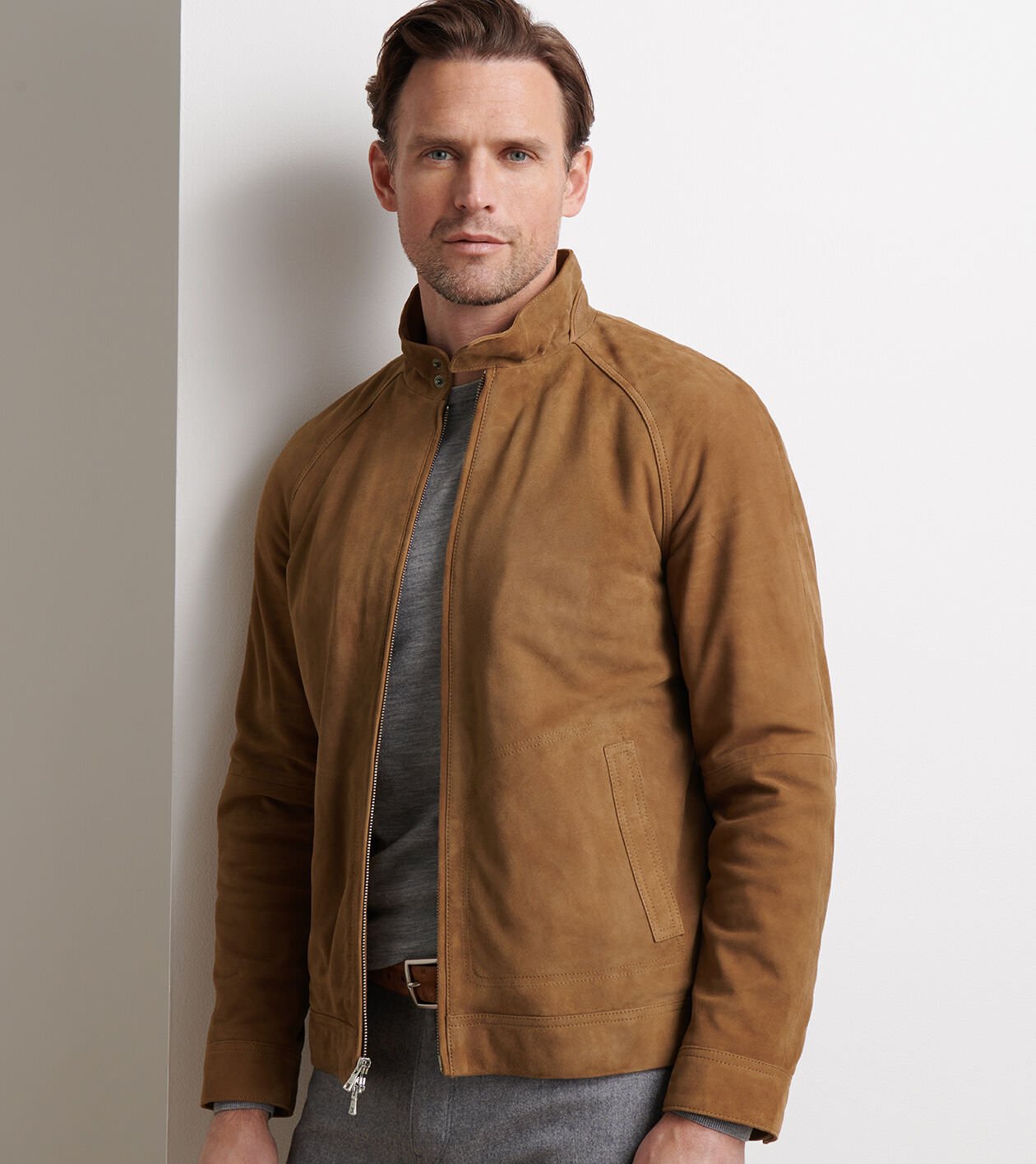 This luxurious bomber is crafted from a supple, remarkably lightweight suede that's been enriched with water-resistance. A silky microfiber lining provides wind-resistance and effortless layering. Finished with snap button sleeves.